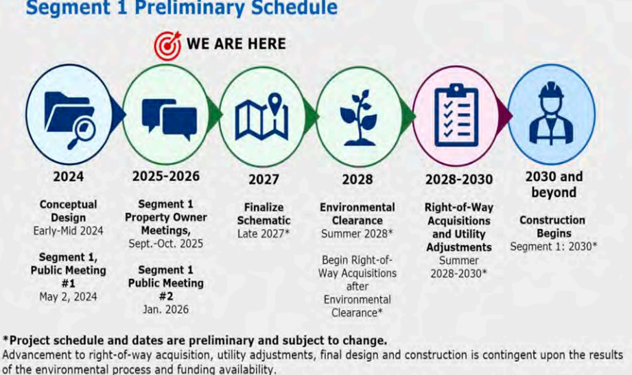 The first round of public meetings for Segment 1 was held May 2, 2024, in Belton. At that meeting, residents addressed existing congestion and safety concerns, local access and roadway conditions, and impacts to properties and neighborhoods.